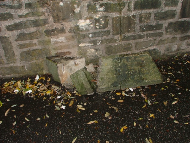 Broken stone, eroded/illegible inscription, broken or missing metal plate?