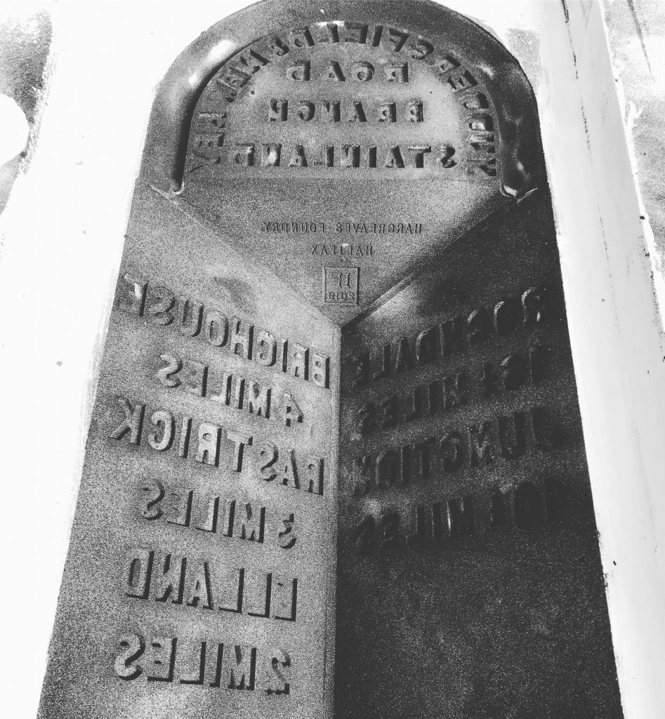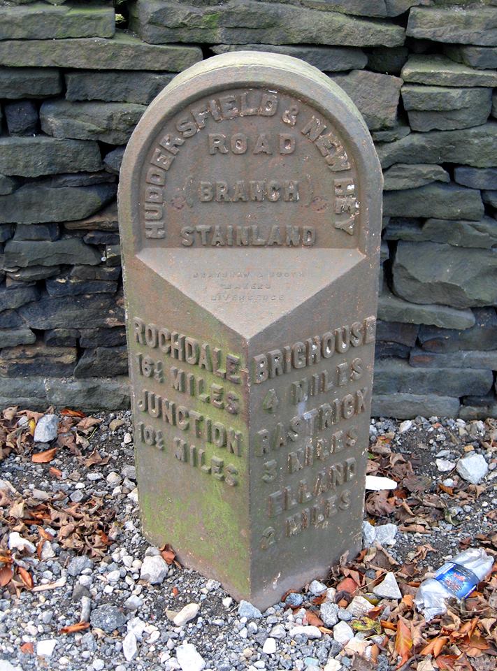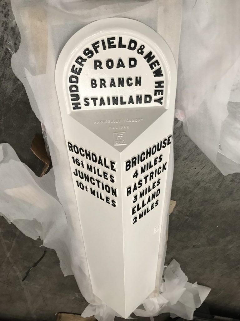 The foundry of Brayshaw & Booth at Liversedge in West Yorkshire cast some 620 mileposts at the request of the new West Riding County Council in the 1890s. These were to be “six inches thick, with iron plates, bolted, showing the name of the road, township and mileage to nearest towns”. The stone was to come from the Horsforth Quarries and the milestones were to be 6 feet high, set two feet into the ground. The estimated cost would be £2-5-0d each. The contract was awarded to G & F Stead, stonemasons in Mirfield (Gill Stead and his son Frank), who erected 619 stones within 12 months, a prodigious achievement. Over half of these milestones still survive in place, apparently not having been removed or defaced in WWll.
