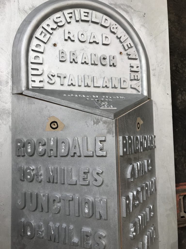 Hargreaves Foundry in Halifax was tasked with the job. They prepared a wooden pattern (fig 2) and from this a mould (fig 3) made of Furan Resin Sand which came from China. This is a kind of self-hardening sand; after the coating is burned, the surface of the sand mould becomes extremely hard. A model was prepared (fig 4) then the final cast was made and painted (fig 5). The white coating was sprayed on using an AE52 paint system, a two pack polyurethane finish designed to have excellent durability and abrasion resistance – the technical instructions state that ‘Substrates must be thoroughly cleaned, dry and free from contaminants, corrosion and grease prior to coating’. The black lettering was AE53, ‘A high solids Polyurethane Compliant Finish for general purpose use with good salt spray resistance’, applied by roller. The casting bears the name of the foundry and the date 2019.