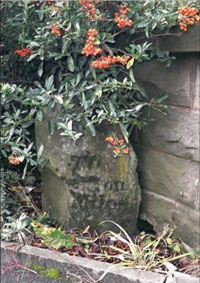 Continue over the River Tame and through the Square. Uppermill has a variety of lively shops, ranging from the downright practical through stylish to very quirky! Beyond the shops, cross the Kenworthy Gardens road and look carefully into the prickly hedge by the new wall. Under the vegetation, you will see a small old milestone that has been damaged, which shows Huddersfield and Ashton on its faces. 1