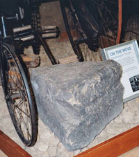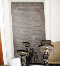 Do take some time to visit Saddleworth Museum and Art Gallery, www.saddleworthmuseum.co.uk, well worth the small entry fee. Amongst the exhibits is the capstone 11 of the 1750s Saddleworth Waymark, 12 which originally stood where the Standedge Road joins the A62 Huddersfield Road. The story told is that young men returning from a night out would challenge each other to lift the capstone onto the nearby wall and back again; apparently only one man was able to accomplish this! Saddleworth is also famous for its rush-cart procession, with its convivial morris dancers. 13 Another exhibit is the Platt Lane toll board, showing the rates for each class of vehicle and animal. 14 The width of the wheels or fellies also determined the amount due, because narrower wheels caused more damage to the road surface. There is also an unusual “Take off here” stone, indicating when the additional horse required to help pull a coach or wagon up the hill should be removed.
