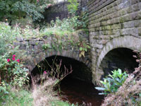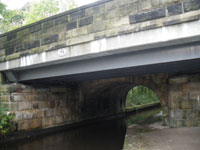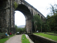 Continue along the tow-path under the viaduct towards Uppermill. 7 Notice the skewed stone work of the arch and the protruding corbels to support the construction platform.