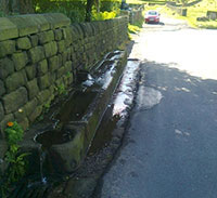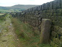 Here you turn right and reach Mankinholes Youth Hostel after 200 yards. Note the 17th Century cottages and farms 3 within the village and also the magnificent drinking trough 4 , a sure sign of the importance of this packhorse route. Have you seen a better example? Just past the trough, turn left, still on the Pennine Bridleway. 5 You are now on London Road, for many centuries the main route along the Calder Valley that steadily contoured along the hillside for many miles visiting Mytholmroyd, Sowerby and Sowerby Bridge before reaching Halifax. Follow London Road for 1.5 miles until you reach a right hand turn sign-posted Pennine Way and Stoodley Pike 6 . This steadily-rising track reaches a wall after 650 yards. 7