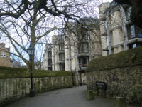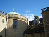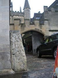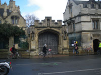 Turn left down the High Street (busy pavement) past Brasenose College on the left, Oriel College on the right, University Church of St Mary and All Souls College on the left, University College on the right, Queen’s College on the left and Examination Schools on the right. Cross Longwall Street at the traffic lights. Continue down the High Street. Just past the junction with Merton Street on the right is the Eastgate Hotel, site of the former East Gate. Continue as far as Magdalen College Porter’s Lodge, opposite Rose Lane.