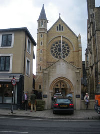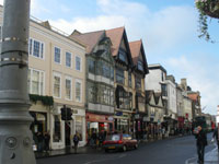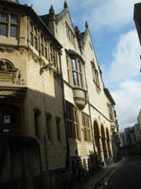 Carry on down St Giles; cross Beaumont Street at the traffic lights (Ashmolean Museum on the right) into Magdalen Street. Immediately cross the road at the traffic lights, walk past the Martyrs Memorial; cross the short bus-only road, Magdalen Road East, and turn right, taking extra care if there are crowds of tourists as well as careless cyclists. Follow Magdalen Road East to the junction and turn left into Broad Street,24 crossing to the far side (a pedestrian zone but beware bikes). Walk along Broad Street and turn into the first road on the right, Turl Street. Follow Turl Street to the end at the junction with High Street. Exeter and Lincoln Colleges on the left, Jesus College on the right.