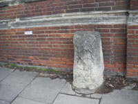 Turn right and walk up Woodstock Road. By St Giles Church Hall, opposite St Aloysius RC Church 21 at the 20/30 speed limit sign, is a milestone 22 (SP 5100 0701) [3.4 miles]. This is ‘London 55’, so badly degraded as to be indecipherable. All the inner city milestones have suffered badly in recent decades from pollution and neglect.