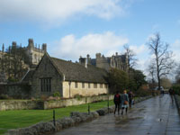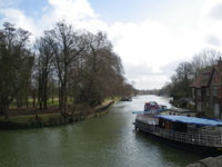 Enjoy the view from Folly Bridge over the river Isis (Thames); to cross the road safely, walk over the bridge to the traffic lights in pre-1974 Berkshire. Turn back over the bridge, looking down 30 at the punts moored above the bridge, pass the Head of the River pub, and immediately turn right and walk through the pub car park down to the riverbank; cross the bridge at the end, through the kissing gate on to the gravel path alongside the Isis. Wheelchair users should return along St Aldates, turning right into Blue Boar Street and Bear Lane. Follow Bear Lane into Oriel Square (Oriel College opposite). Bear right and then left into picturesque, cobbled Merton Street, past Corpus Christi and Merton Colleges on the right and the real tennis court on the left. Near its end Merton Street swings round to the left to meet the High Street by the Eastgate Hotel. Turn right and follow the High Street to the junction with Rose Lane and rejoin the main route at **